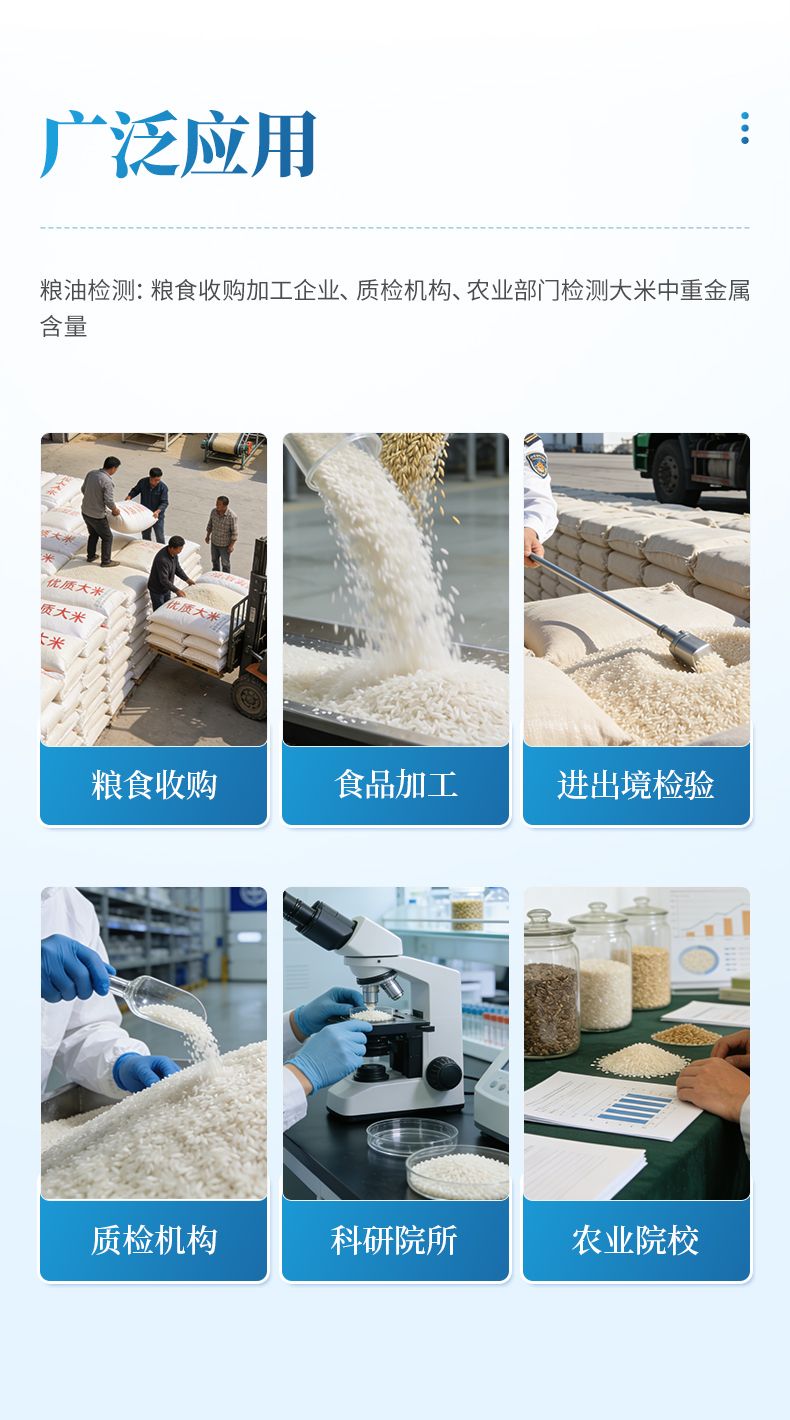糧油檢測(cè):糧食收購加工企業(yè)、質(zhì)檢機(jī)構(gòu)、農(nóng)業(yè)部門檢測(cè)大米中重金屬含量。